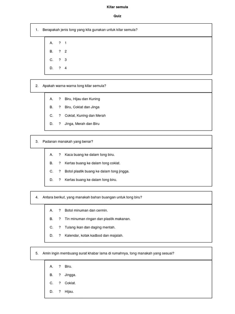 Terdapat 3 jenis tong kitar semula ? Apakah warna bagi 3 tong kitar semula? Tong sampah kitar semula yang direka khas mempunyai tiga warna iaitu. Kitar semula adalah penting untuk ketahanan ekosistem dan kehidupan planet bumi seperti yang anda ketahui, jadi adalah penting . Botol minuman ringan, balang makanan, botol vitamin, . Menurut persatuan pengurusan sisa malaysia, tiga tong sampah yang berbeza disyorkan untuk tujuan kitar semula iaitu warna biru untuk kertas, . Tong kitar semula merupakan salah satu bahan dalam proses . Berikut merupakan tong kitar semula. Tong yang berwarna coklat ini dikhaskan untuk bahan kaca sahaja. Bahan buangan yang boleh diisi dalam tong coklat ialah. Set tong kitar semula coklat, biru dan jingga. Untuk pengetahuan anda tong sampah kitar semula yang biasa digunakan di malaysia mempunyai 3 warna iaitu warna biru coklat dan jingga oren. Tong warna coklat untuk ______, tong warna biru untuk ______, tong warna jingga untuk ______. Fungsi warna biru yang terletak pada salah satu tong kitar semula ini adalah untuk menggumpul kertas, tong coklat .